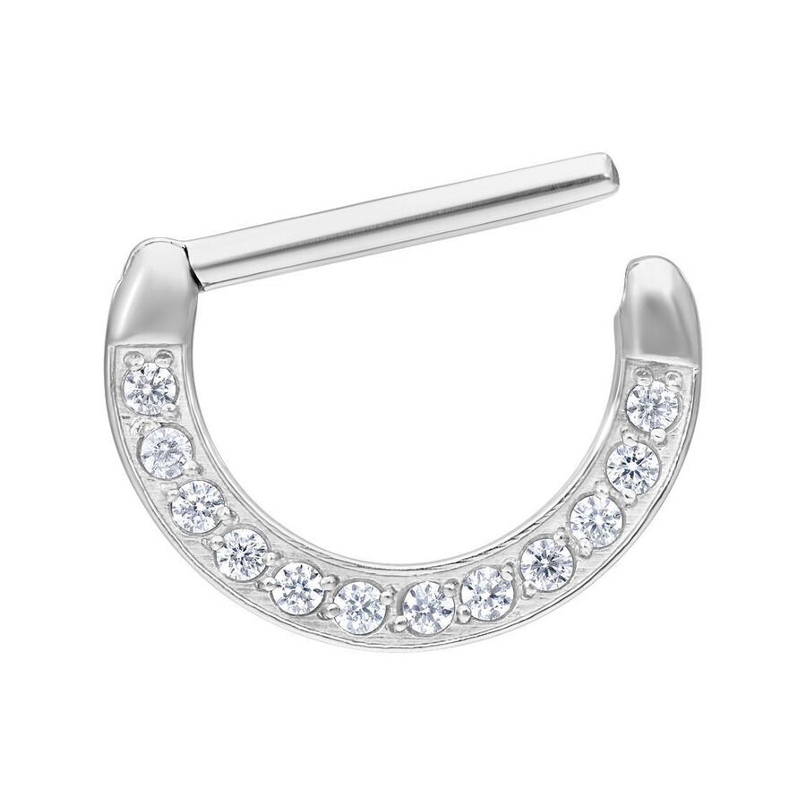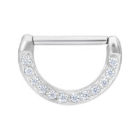 Das Piercing besteht aus klassischem, hochwertigem Edelstahl. Einen besonderen Eye-Catcher geben die runden, gefassten, Kristalle, die bei Lichteinfall wunderschön schimmern.
