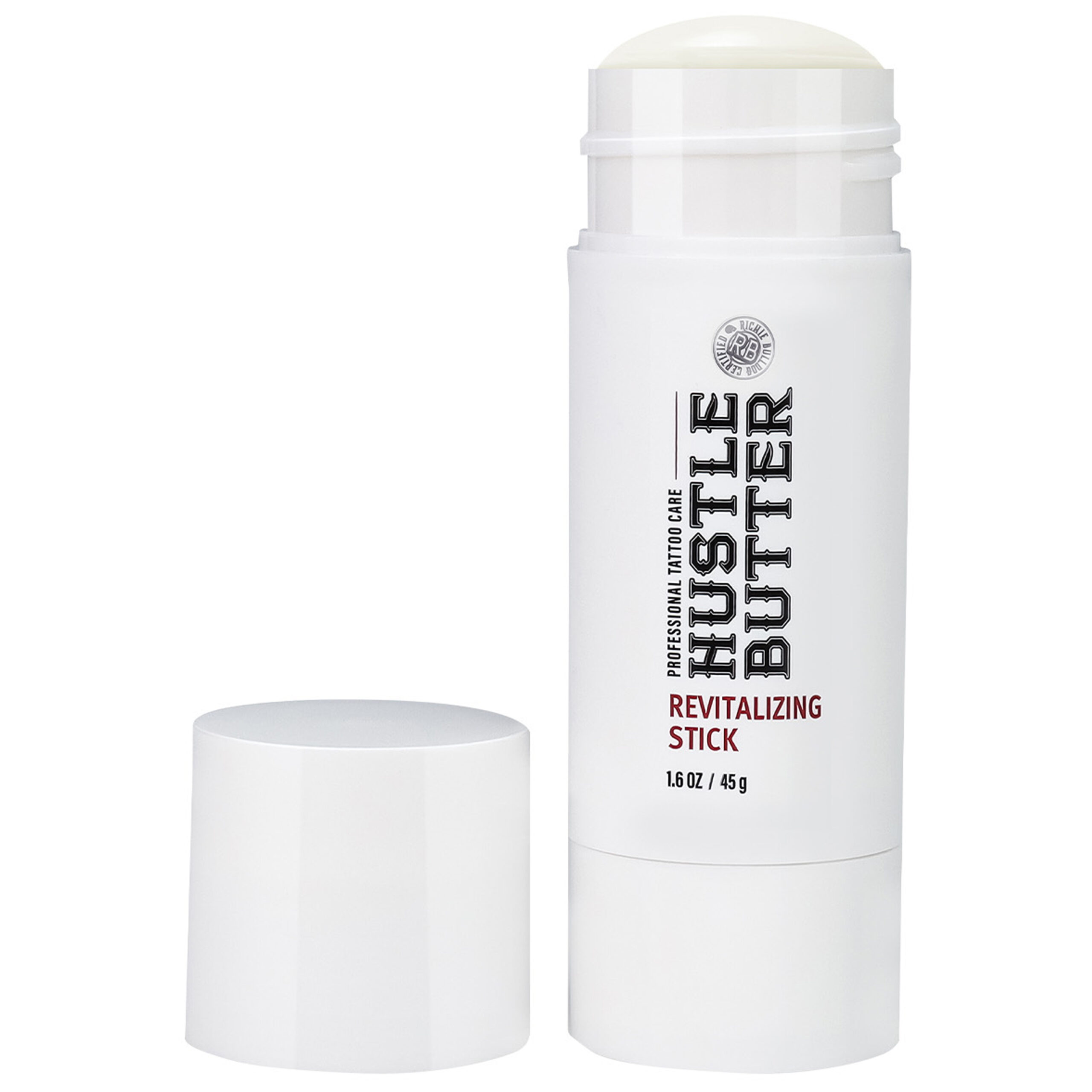 Hustle Butter Revitalizing Stick is your tattoo’s perfect companion. Take it with you on-the-go to keep your tattoos looking and feeling their best – anytime, anywhere. Inspired by our OG Tattoo Balm, this balm stick delivers targeted care to keep your artwork looking and feeling fresh whenever you need it most. Plus, with vegan, cruelty-free, and naturally-derived ingredients, you can feel good about reapplying all day, everyday. This convenient and portable tattoo balm stick has you covered everywhere you go. No mess, no clean up, just Pure Hustle. Gently glide the stick on your artwork and you’re good to go. Whether you are pulling up to the gym, a hot date, or just want your tattoos to shine while sitting on the couch – you’ll be reaching for this stick over and over again. But don’t just take our word for it – try it for yourself. You won’t regret it.