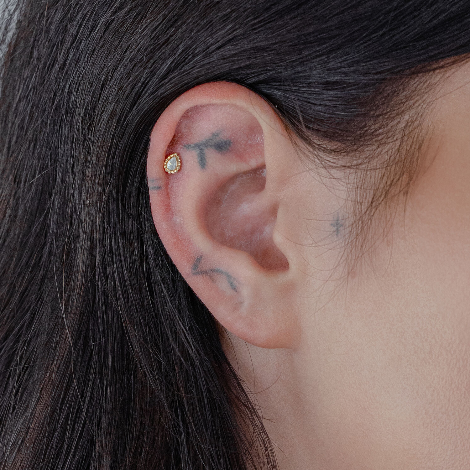 The Crystal Drop Attachment from the Wildcat Collection pairs polished 14 karat (585) yellow gold with a sparkling, teardrop-shaped crystal. Designed specifically for the Perfect Fit Labret (14K), this elegant and feminine piece measures 3.7 x 4.9 mm and weighs 0.14 g. A true eye-catcher that offers both luxurious style and lightweight comfort.