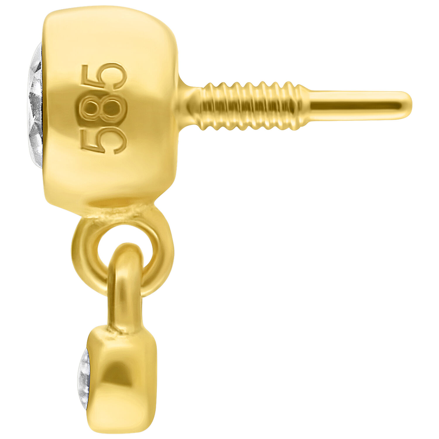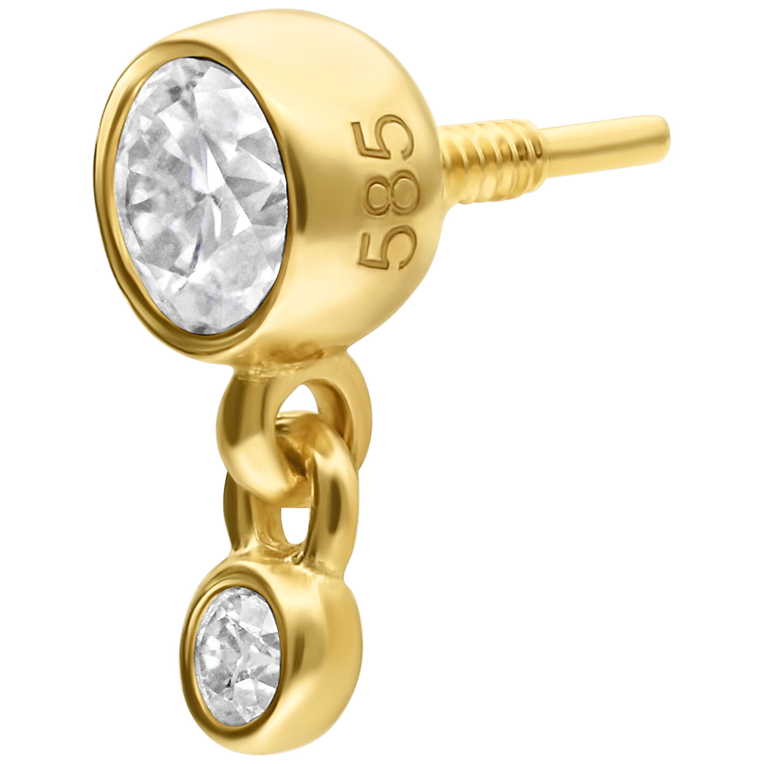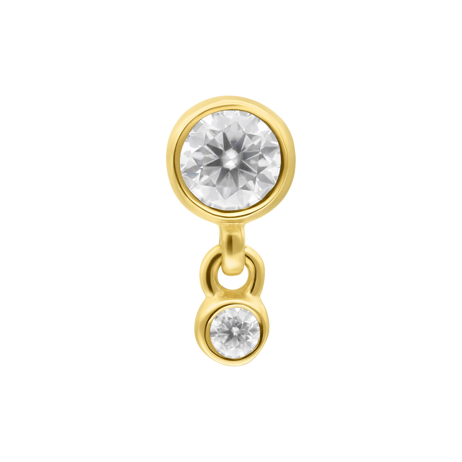 The Double Crystal Attachment from the Wildcat Collection features two sparkling, high-quality zirconia stones in different sizes – the top stone measures 3.1 mm, the bottom 1.2 mm, which hangs freely from the top, allowing it to gently swing. Crafted from polished 14 karat (585) yellow gold and specially designed for the Perfect Fit Labret (14K), this elegant piece combines brilliant sparkle with excellent comfort. Weighing 0.16 g, it’s a luxurious eye-catcher for any occasion.
