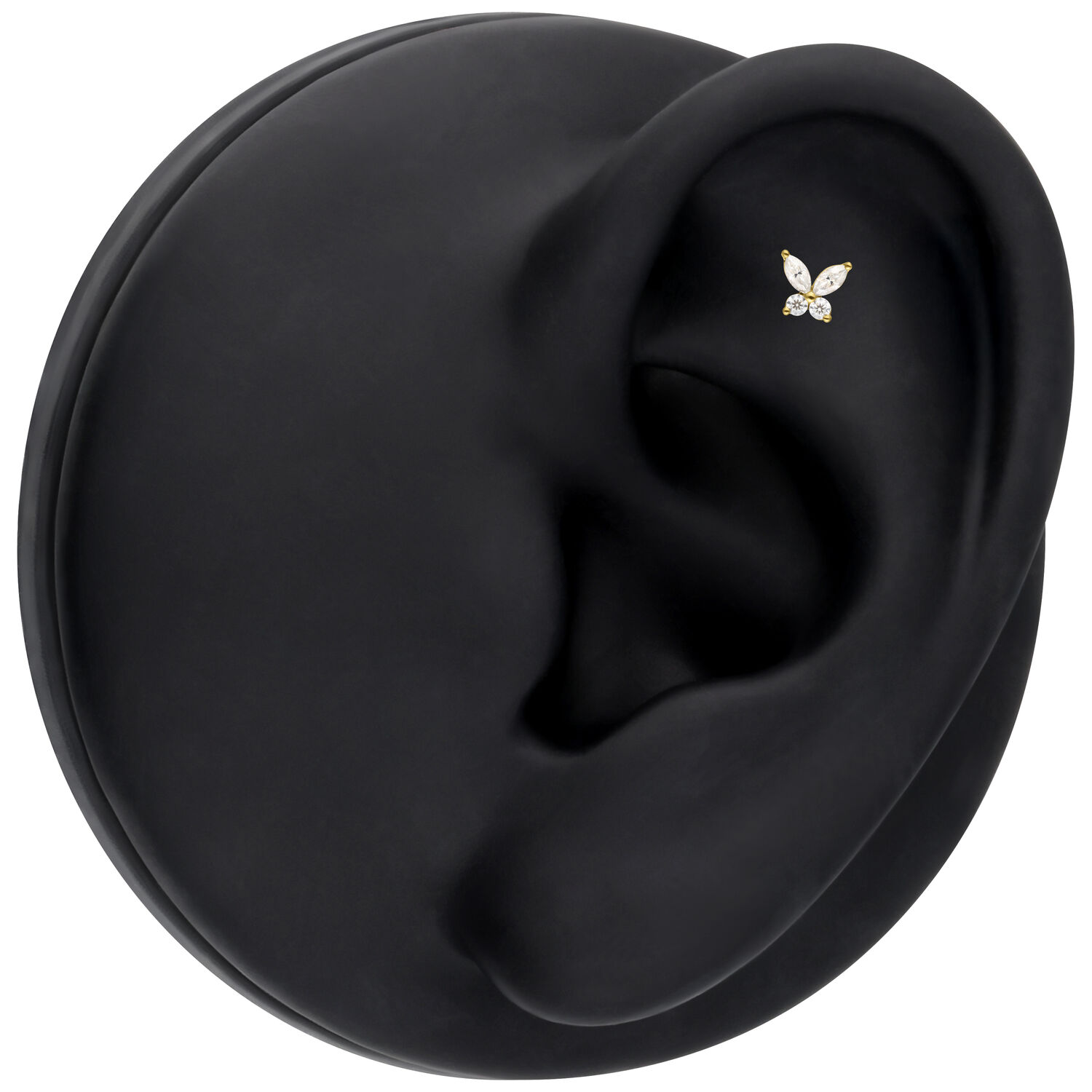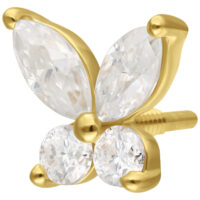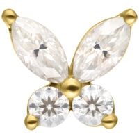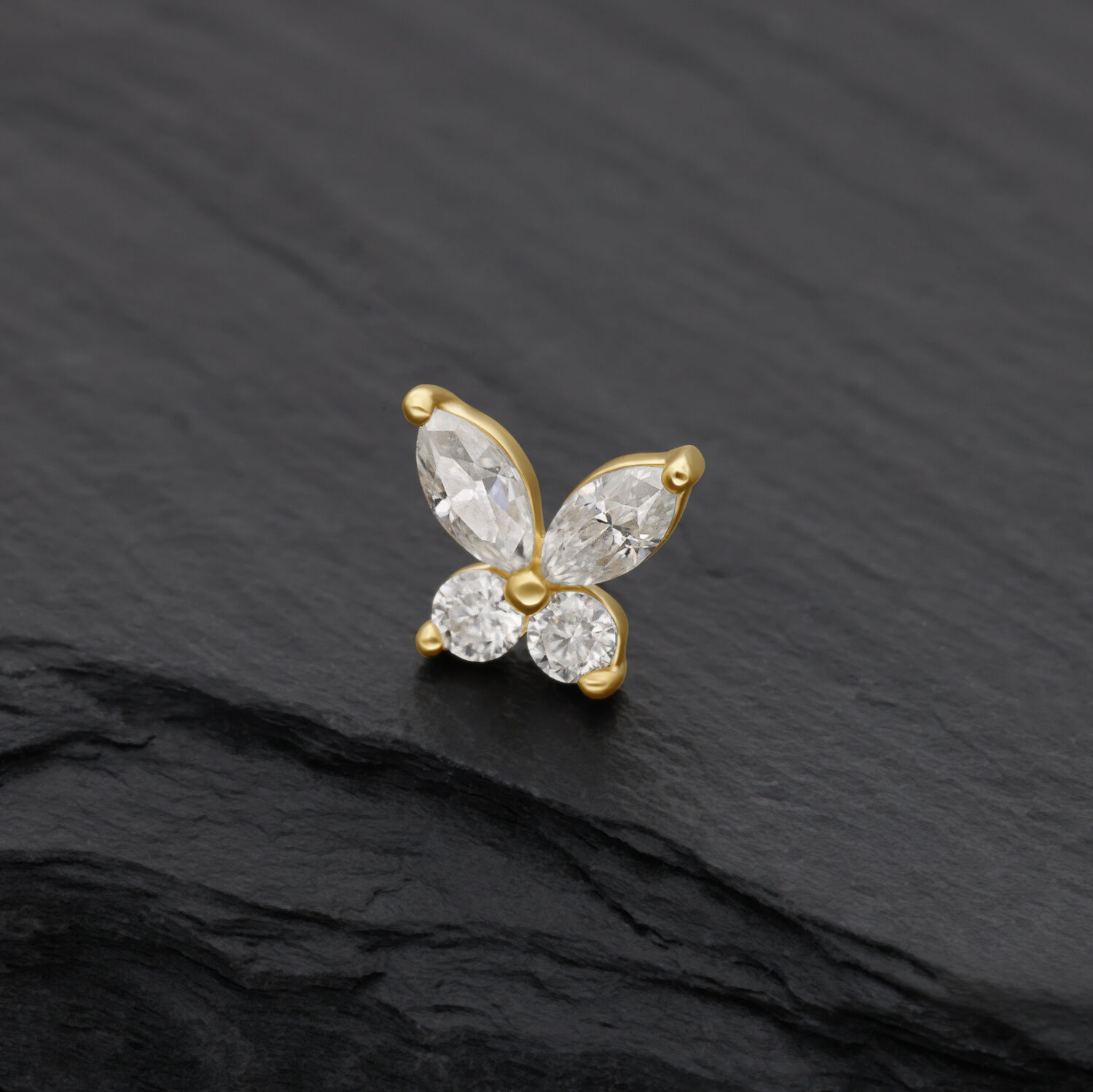 The 14K Perfect Fit Moissanite Butterfly Attachment represents transformation, freedom, and luminous beauty. Four radiant moissanite gemstones form a graceful butterfly shape that captures and reflects light with every movement.