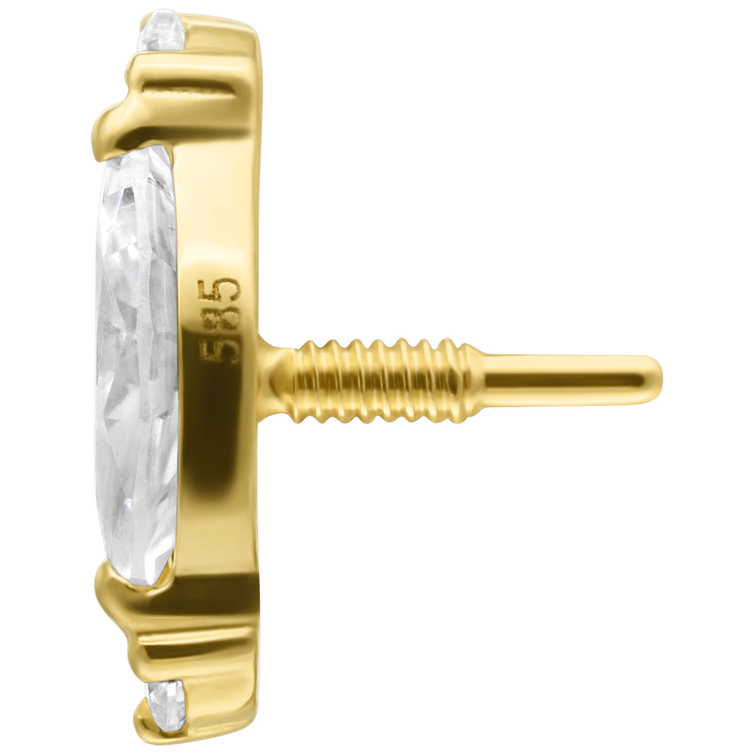 Our radiant Moissanite Attachment from the Wildcat Collection is crafted from polished, high-quality 14-karat (585) yellow gold and designed specifically for the Perfect Fit Labret (14K). At its center shines a sparkling moissanite, perfectly showcased by the elegant design measuring 3.5 x 6.4 mm. Weighing only 0.11 g, this attachment offers exceptional comfort in a luxurious finish.
