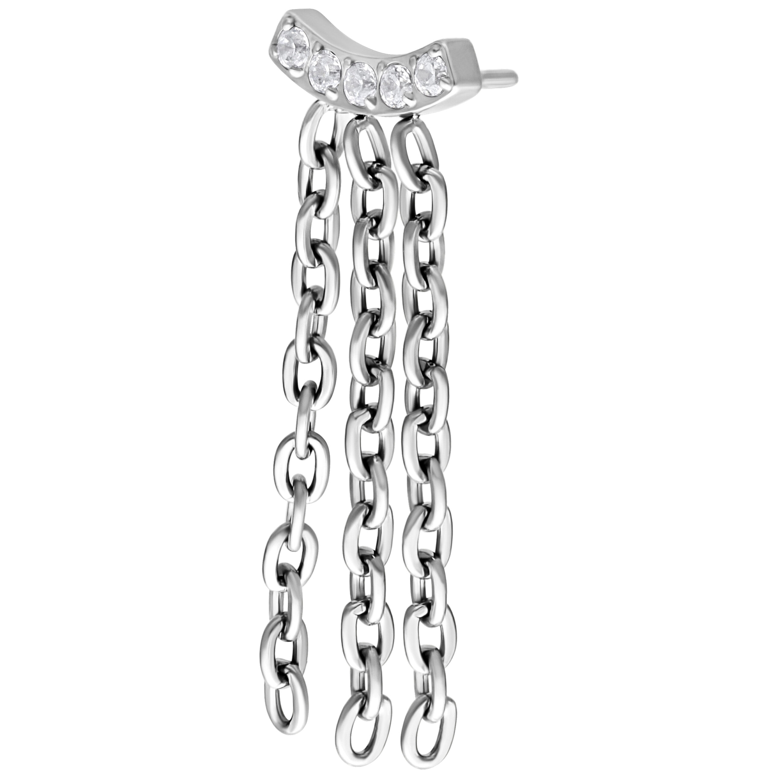Are you looking for a touch of shine and attitude? Our Push Fit Crystal Bar Chain Attachment with sparkling crystal arch and cascading chains is a statement piece that immediately catches the eye. The fine chains elegantly hang from your ear, giving this piercing an edgy yet playful vibe. A perfect expression of individuality and style.