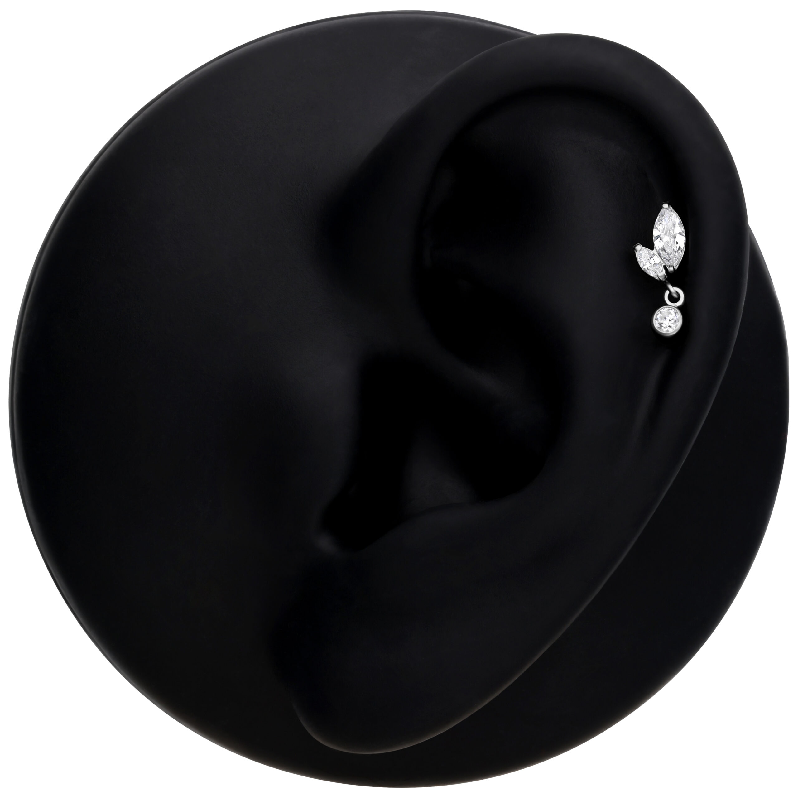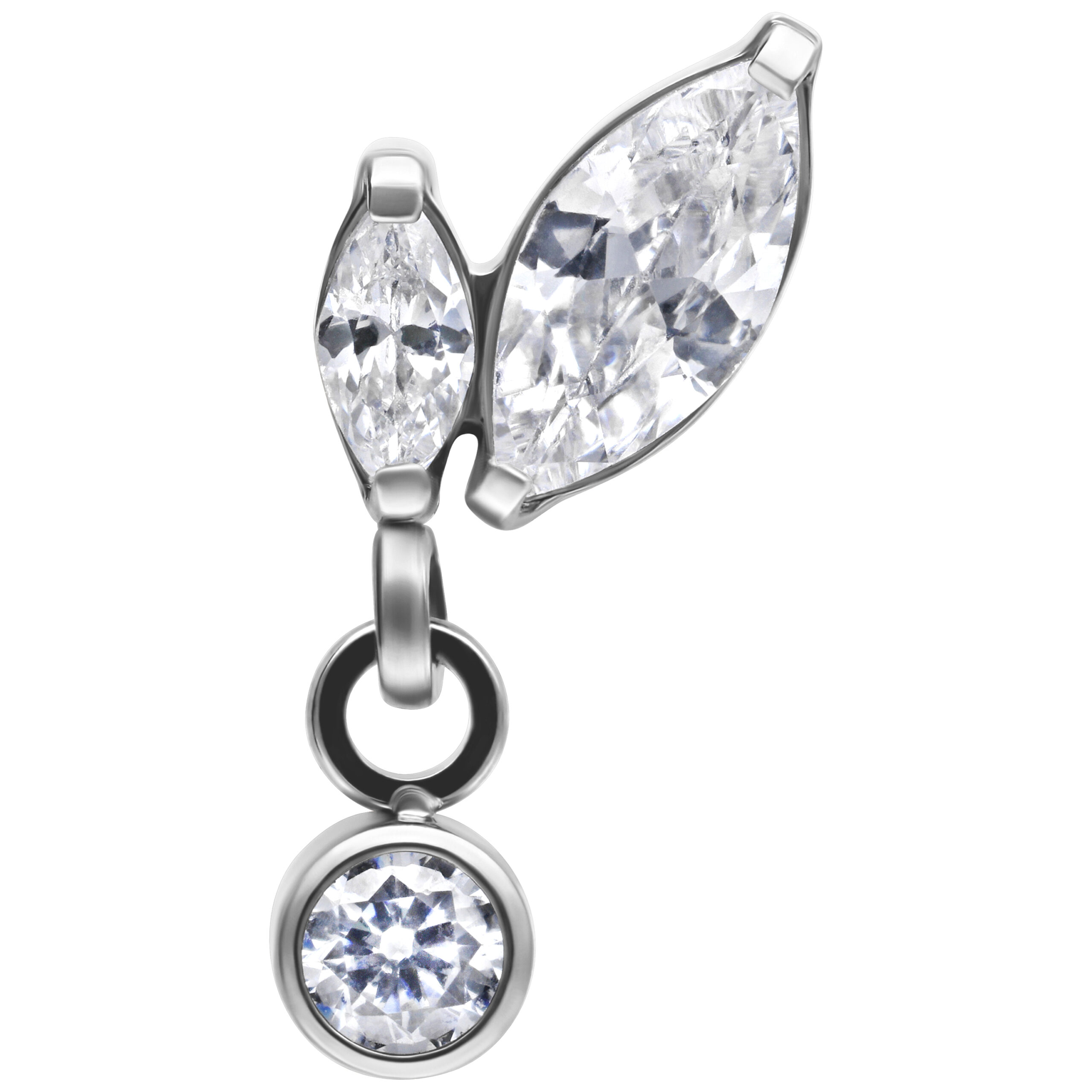 Our Push Fit Double Marquise with Drop Attachment, featuring beautiful oval crystals and an elegant pendant, sparkles beautifully in the light, adding a touch of glamour to any occasion. The pendant swings gently between the two marquise-shaped crystals, making you shine even more with every movement. Whether for everyday wear or special occasions, this stunning accessory is always the perfect choice.