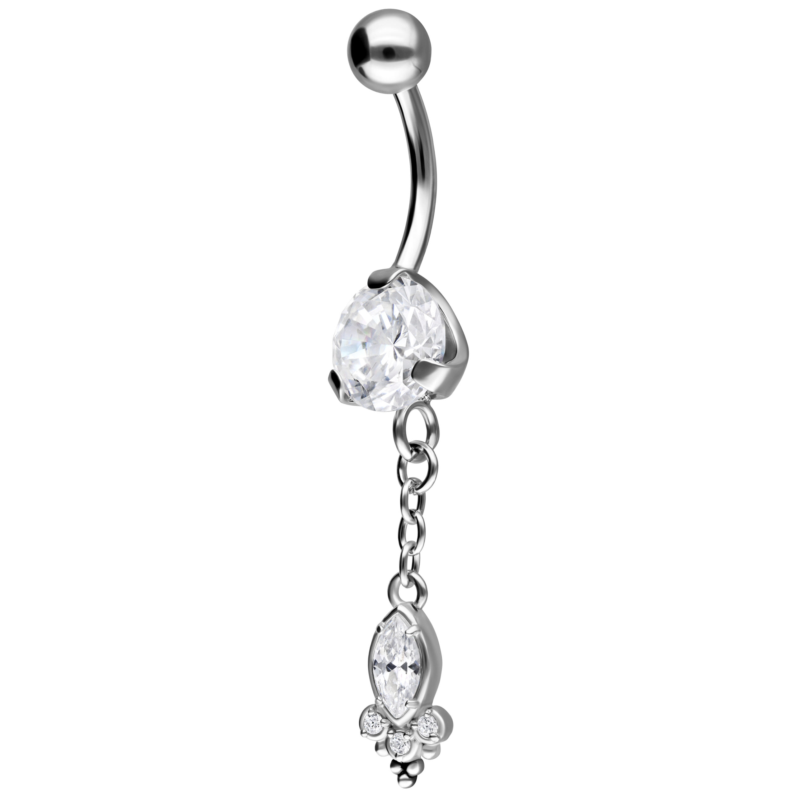 This Dangling Bindi Bananabell of our Steel Basicline® collection has one fixed and one screwable ball. Both balls are decorated with clear cubic zirconia crystals. The slightly curved bar is externally threaded. The complete piece of jewelry is made of high quality 316L surgical steel with a PVD coating that will make your jewelry shine. The jewelry has a thickness of 1.6 mm. Incidentally, all threads in our jewelry collections are standardized, so you can combine the rings, balls, rods and attachments in the right strength with each other! Like all basics of the Steel Basicline®, the item can be sterilized in an autoclave and because of the skin-friendliness of the material, it is also completely safe for allergy sufferers.