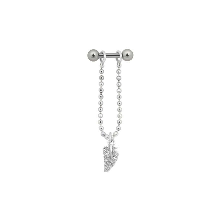 This ear pendant is a cool alternative to ear cuffs for pierced ears. The mini barbell with chain and pendant is perfect for your helix piercing. The bar thickness is 1.2 mm, and the bar length is 6 mm. The balls on both sides are removable.