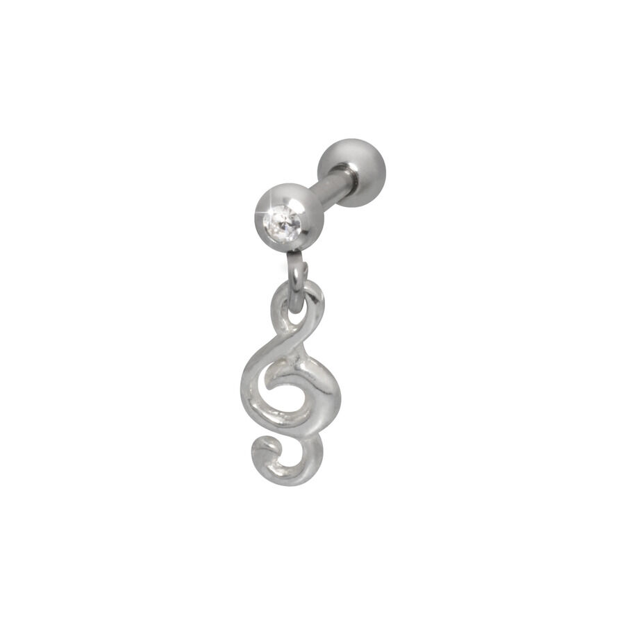 This beautiful barbell is suitable for both the tragus and helix piercing. It has a thickness of 1.2 mm and a length of 6.0 mm. The balls have a diameter of 3.0 mm, with the front ball adorned with a crystal. Additionally, a treble clef charm hangs from the bar. The jewellery is easy to sterilize and, due to the skin-friendly material used, completely safe for allergy sufferers.