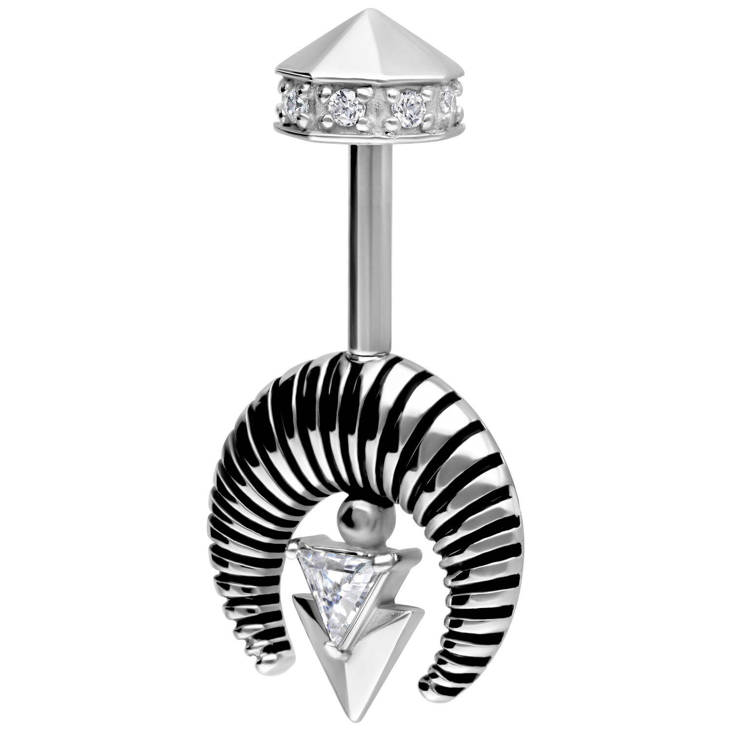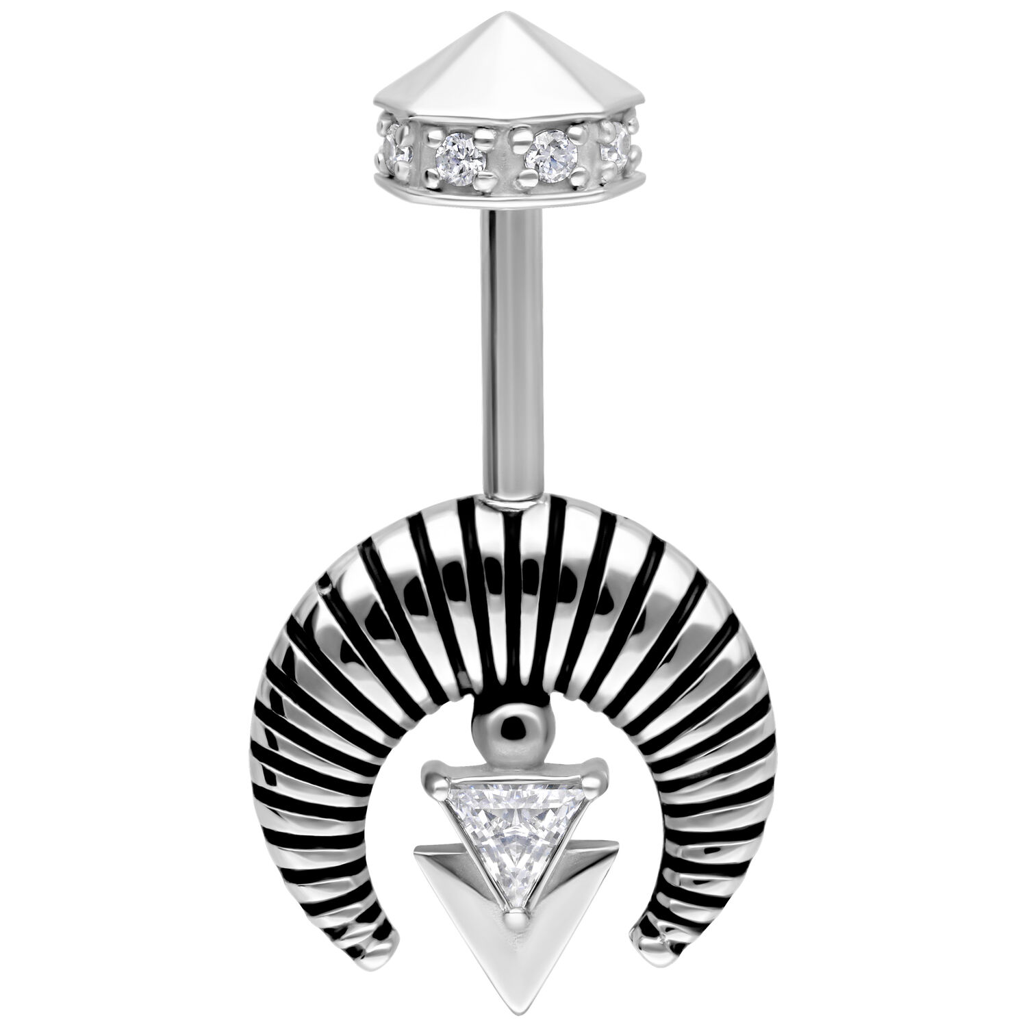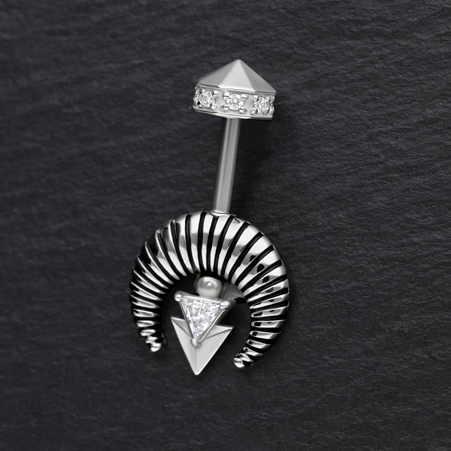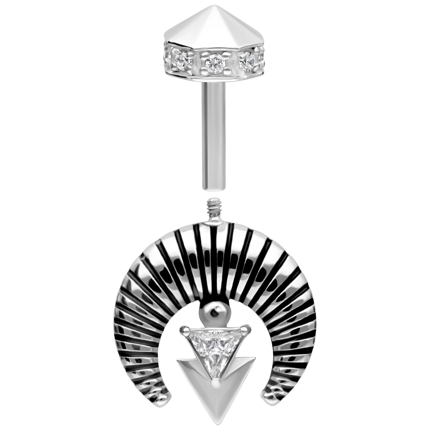 This exceptional piercing jewelry for the vertical helix features a modern, architectural-inspired design. At its center is a sparkling, triangle-shaped zirconia, framed by a bold, ribbed half-circle element. The look is completed with a geometric, downward-pointing arrow motif – a stylish accent with a clean, structured aesthetic. The internally threaded top piece is faceted and adorned with small zirconia stones – a refined eye-catcher for those who love distinctive designs.
