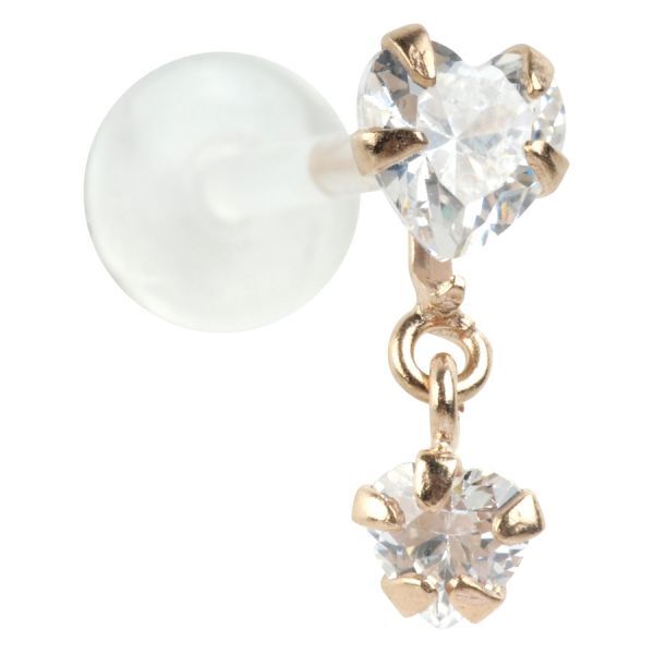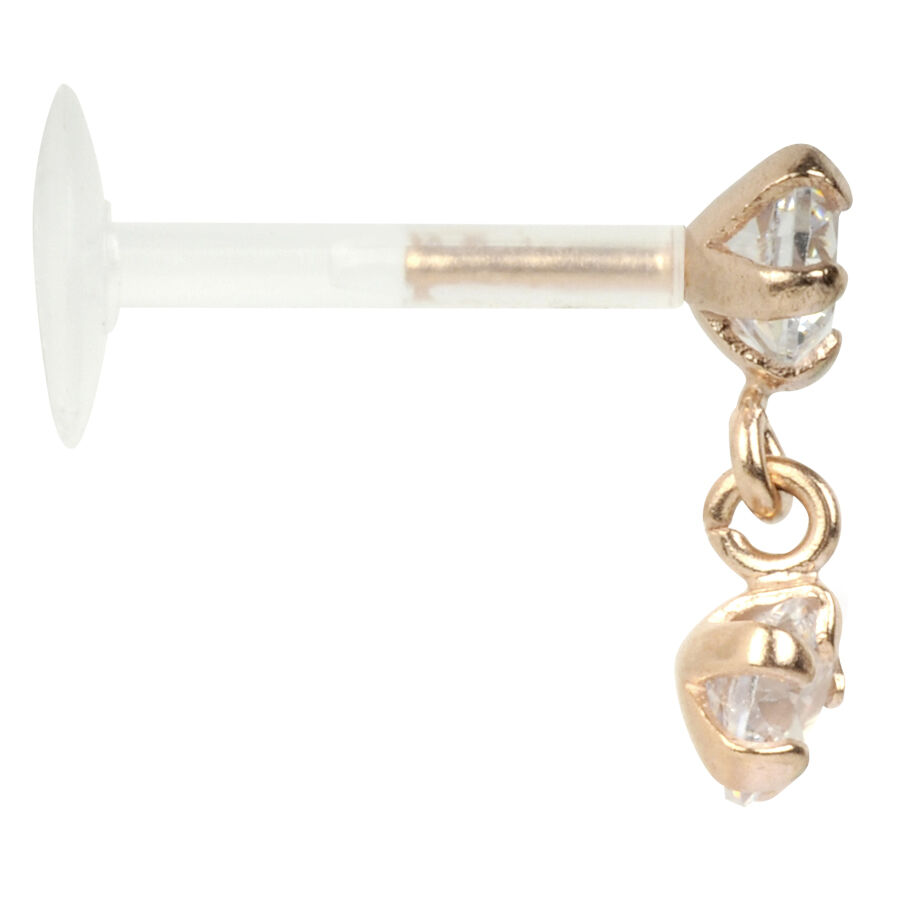 The Bioplast™ Tragus Crystal Hanging Heart labret is available in a strength of 1.2 mm with a length of 8.0 mm. The compatible attachment is made of sterling silver and beset with a classy crystal clear rhinestone.