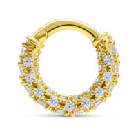 This high-quality 18-karat hinged ring is particularly striking thanks to its beautiful crystals, which will make you sparkle even from afar. The segment ring features a hinged closure, allowing for easy insertion of the piercing. This piercing is especially well-suited for helix piercings but can also be used in many other locations, such as the ear or septum.