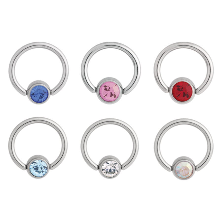 The flat back jewelled clip in ring from Titan Highline® in ring thickness 1.2 mm with flat back is perfect for your lip band piercing. It is available in ring diameters of 7.0, 8.0 and 9.0 mm with a 4.0 mm clamping ball set with precious crystals. You can get these in the colours sapphire blue (SB), pink (RS), red (RE), light blue (LB), clear crystal (CC) and aurora boreale (AB).