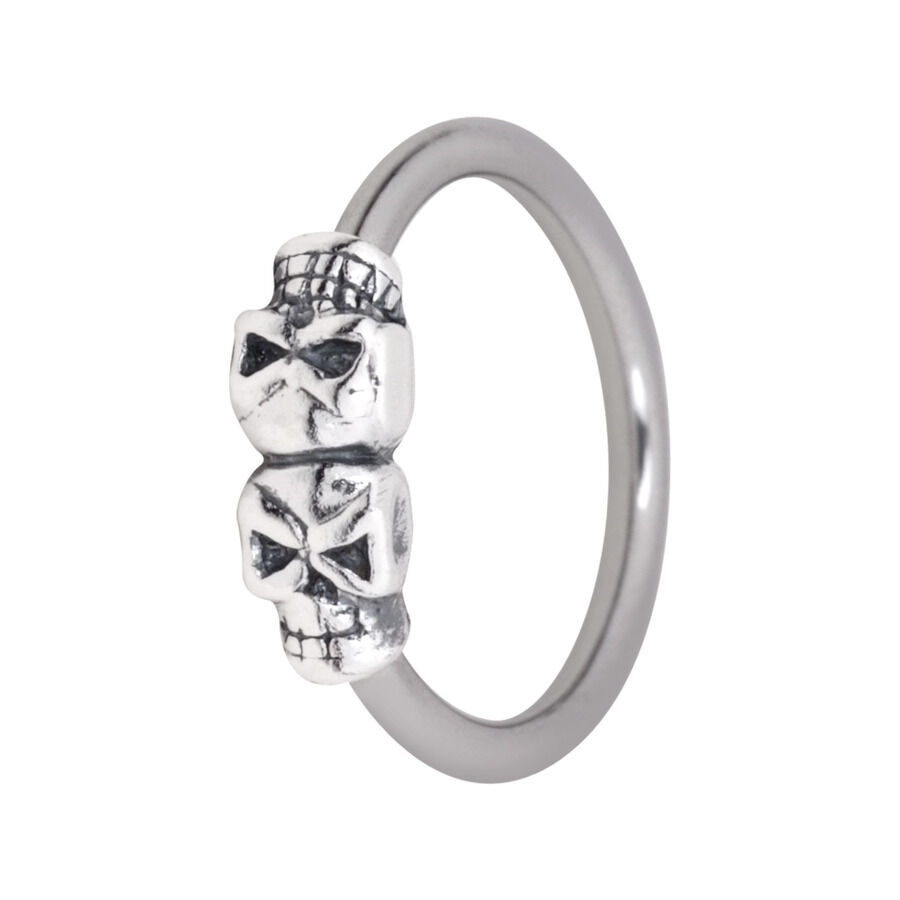 Der Steel Basicline® Mini Skulls Ring hat zwei Schädel aus 925er Silber als Verschluss. Er besitzt eine Stärke von 1.2 mm bei einem Durchmesser von 10.0 mm.