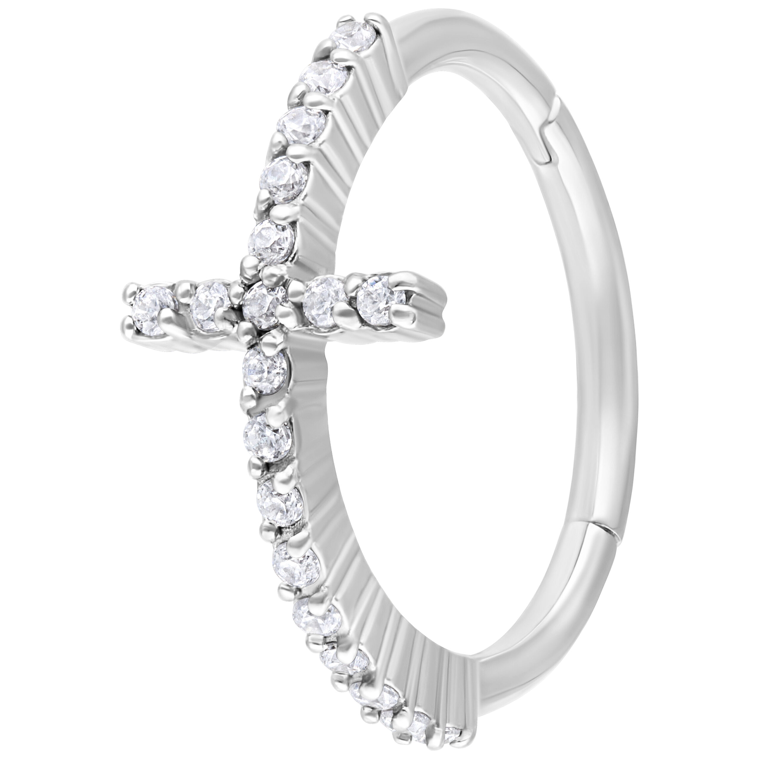 Our high-quality Hinged Cross Ring is a real highlight of our Steel Basicline collection. The cubic zirkonia crystals are absolutely gorgeous! Revamp your conch piercing with this elegant cross piercing ring.
