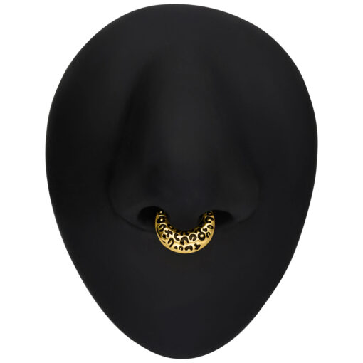 Bold, striking, and totally on trend – the Chunky Leopard Septum Clicker brings the iconic leopard pattern to life in an elegant, modern form. The deep black enamel design, paired with the gold titanium finish, gives your look a luxurious yet rebellious touch – a true statement piece for those who love to stand out.