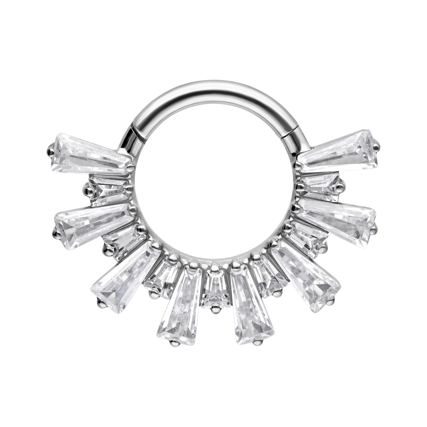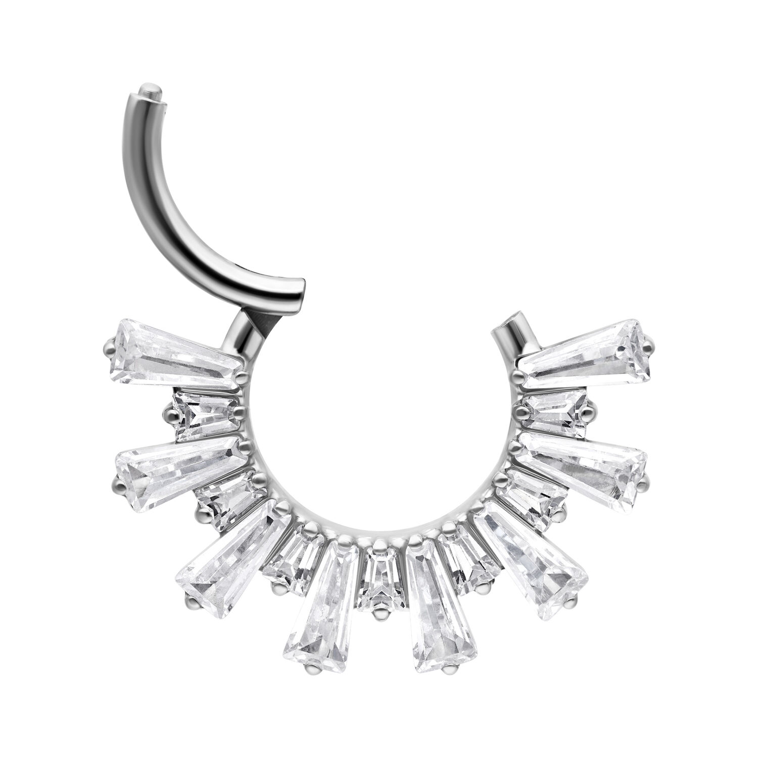 The Crystal Sunray Septum & Daith Clicker made from Grade 23 titanium combines premium materials with a luxurious design. Clear, sparkling crystal stones are arranged in a radiant sunray pattern, creating an elegant and eye-catching look.