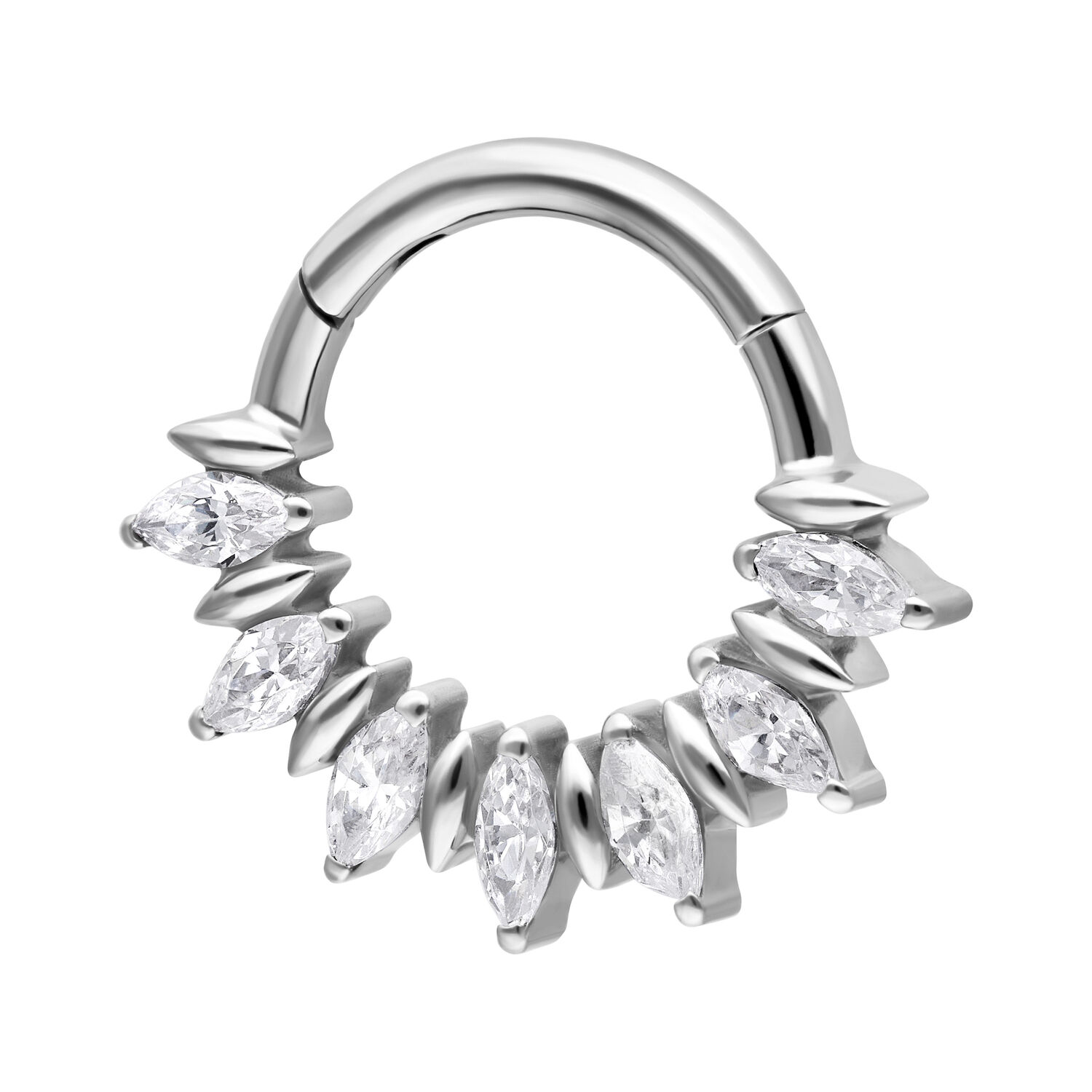 The Marquise Sunburst Septum Clicker features an elegant sunburst design with crystal-clear marquise-cut stones arranged in perfect symmetry. The refined sparkle creates a luxurious yet modern look that enhances your piercing beautifully.