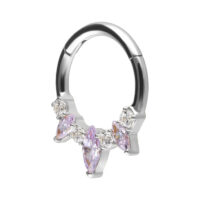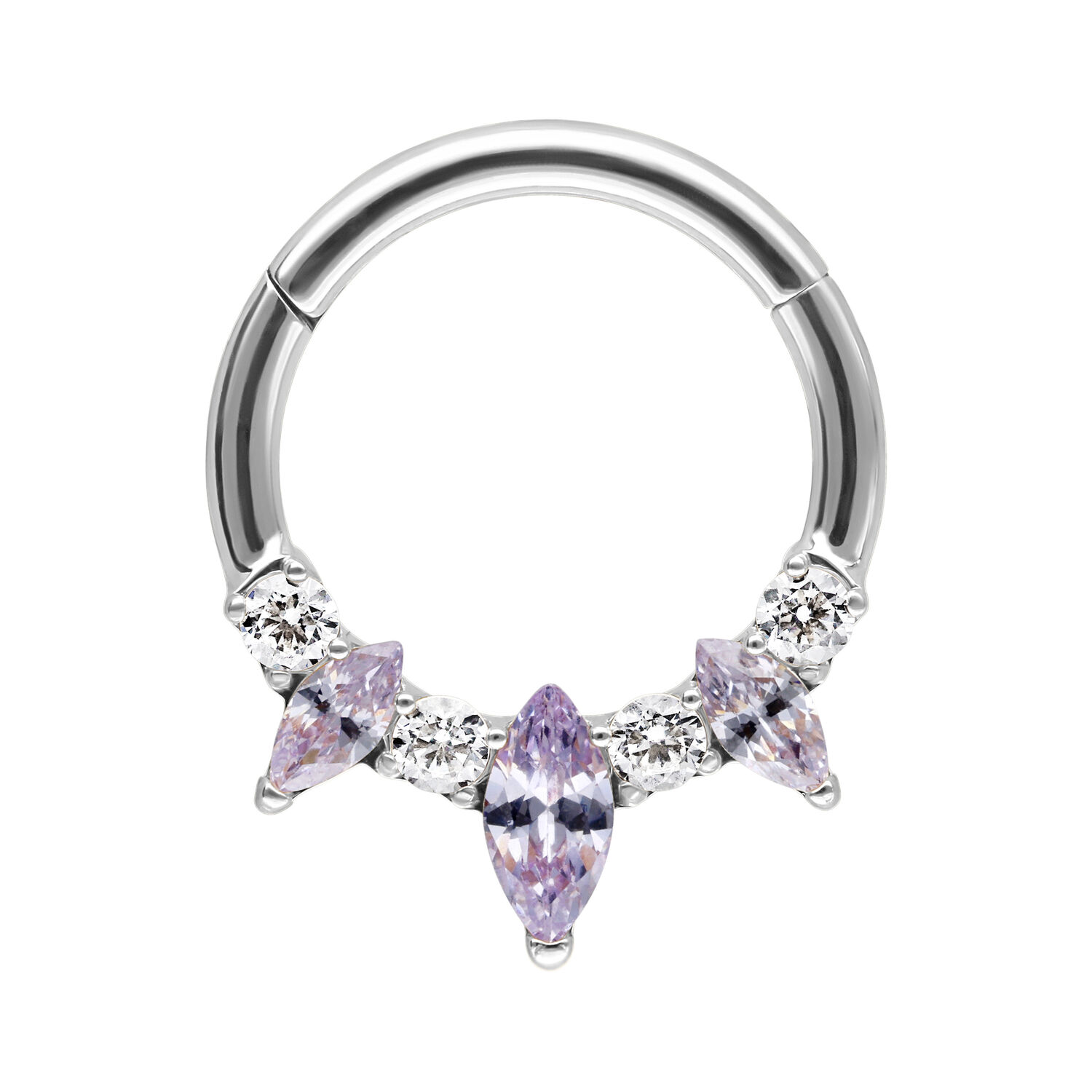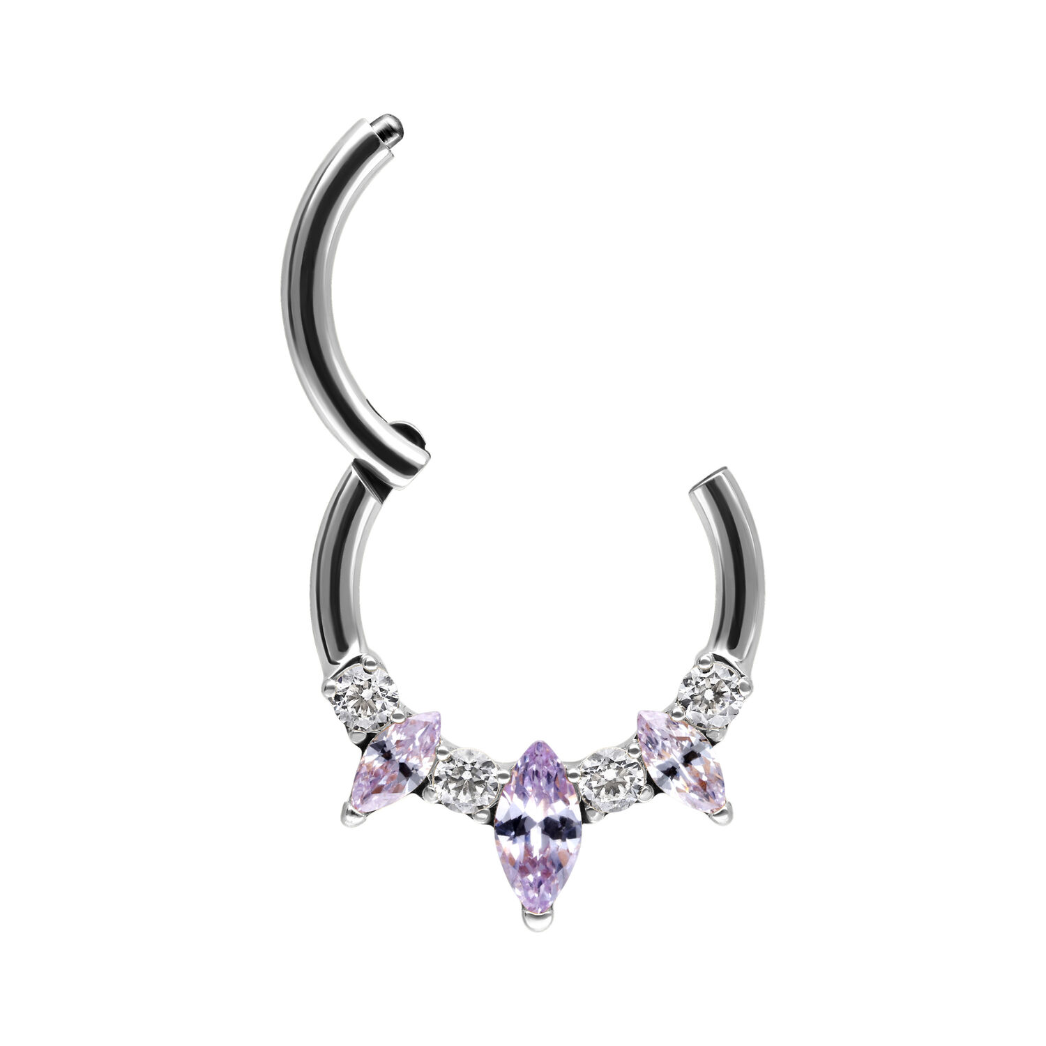 Our Marquise Hinged Septum Clicker is made from high-quality stainless steel and is ideal for your septum or Daith piercing. The piercing features a curved hinge bar, allowing for easy handling when inserting the piercing – all without any help.
