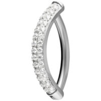 The Multi Jewelled Belly Arch Clicker highlights the navel with an elegantly curved shape and multiple carefully set decorative elements. Their balanced arrangement creates a striking sparkle that enhances the smooth arch of the clicker.