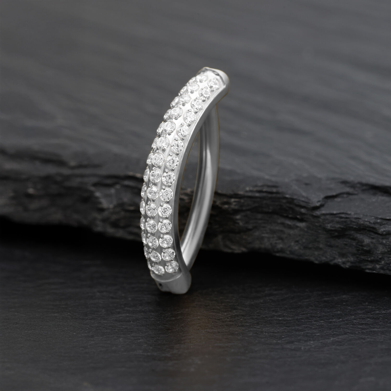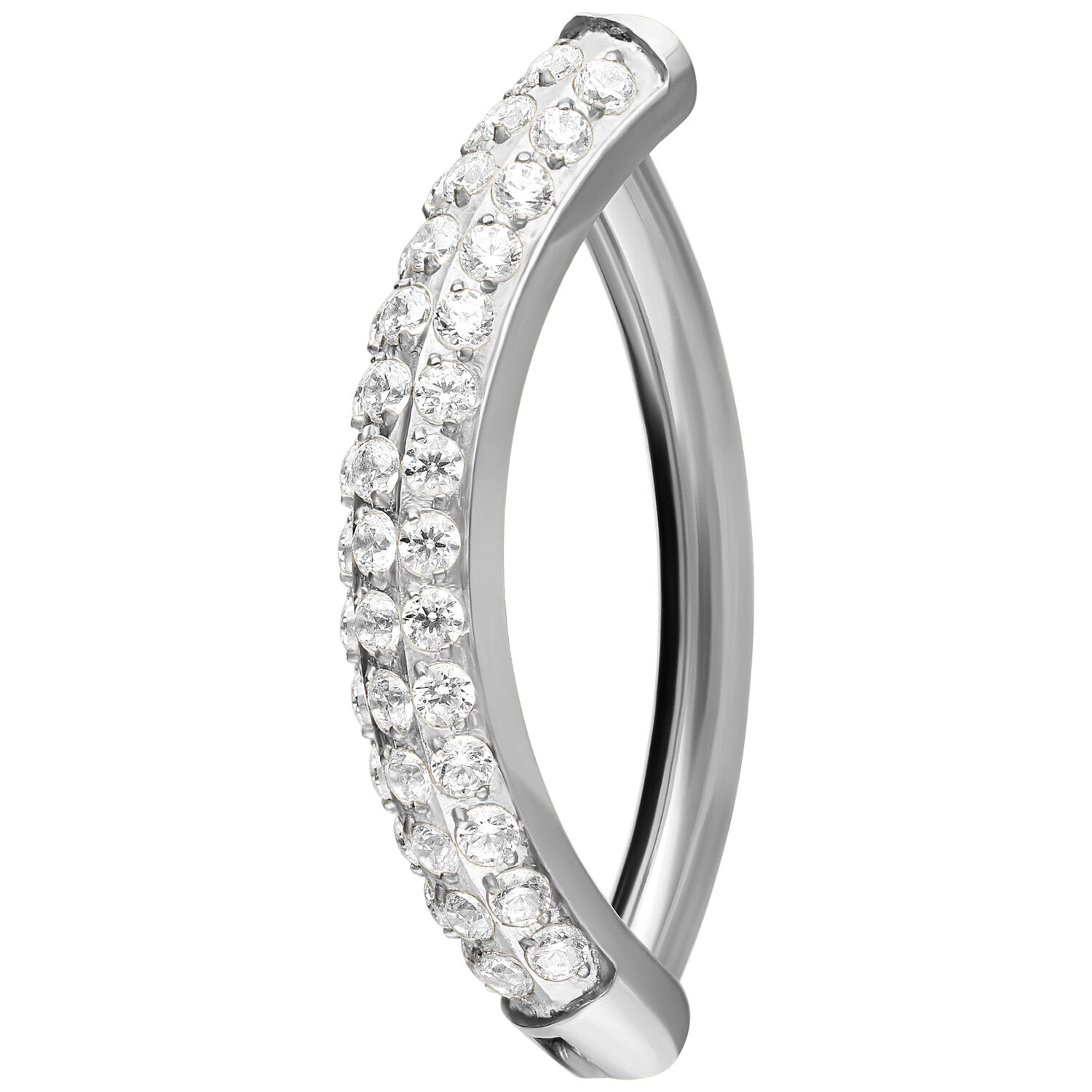 The easy-to-use clicker mechanism allows the jewelry to open and close effortlessly while staying securely in place. The arched design is specifically shaped for navel piercings, ensuring a comfortable fit with a refined appearance.