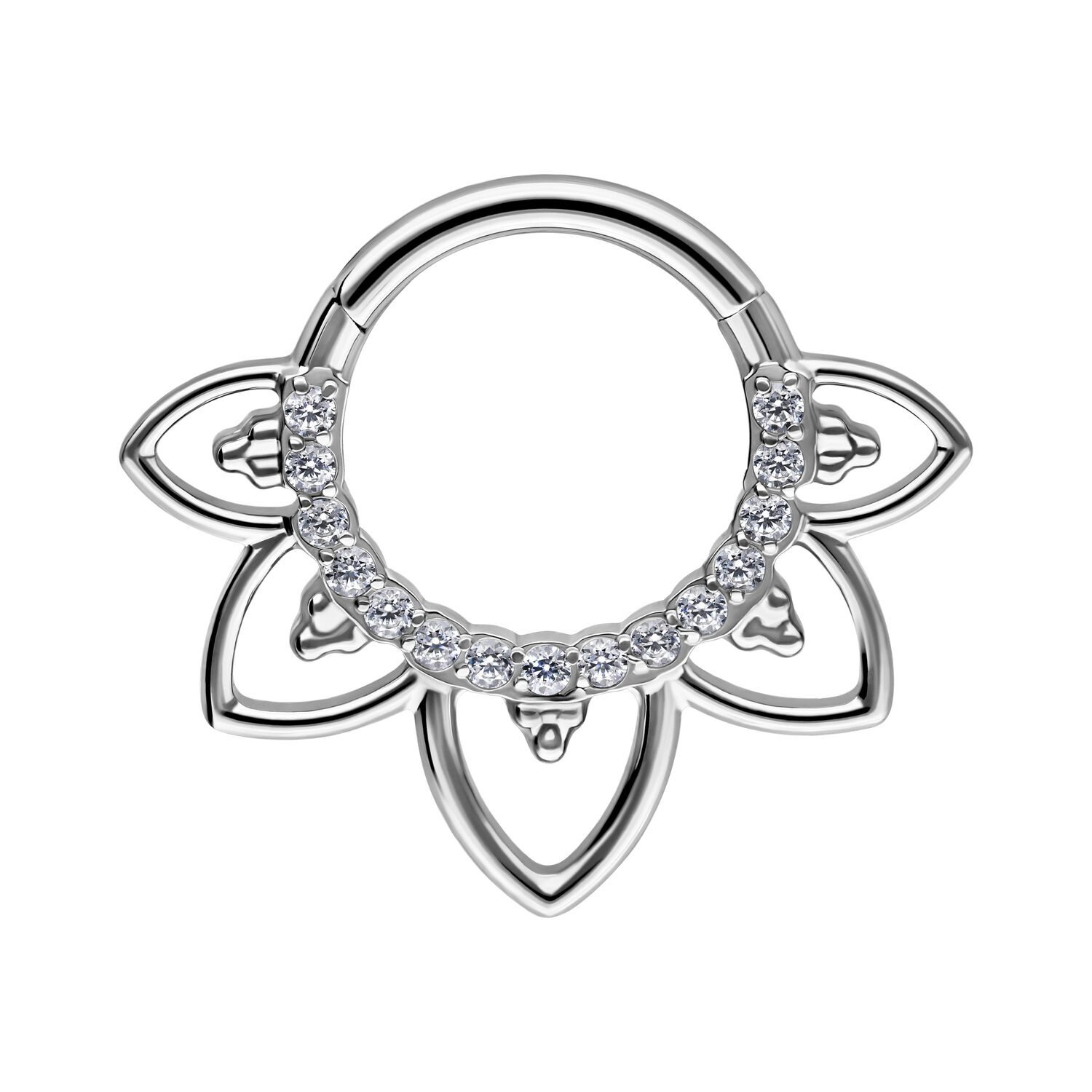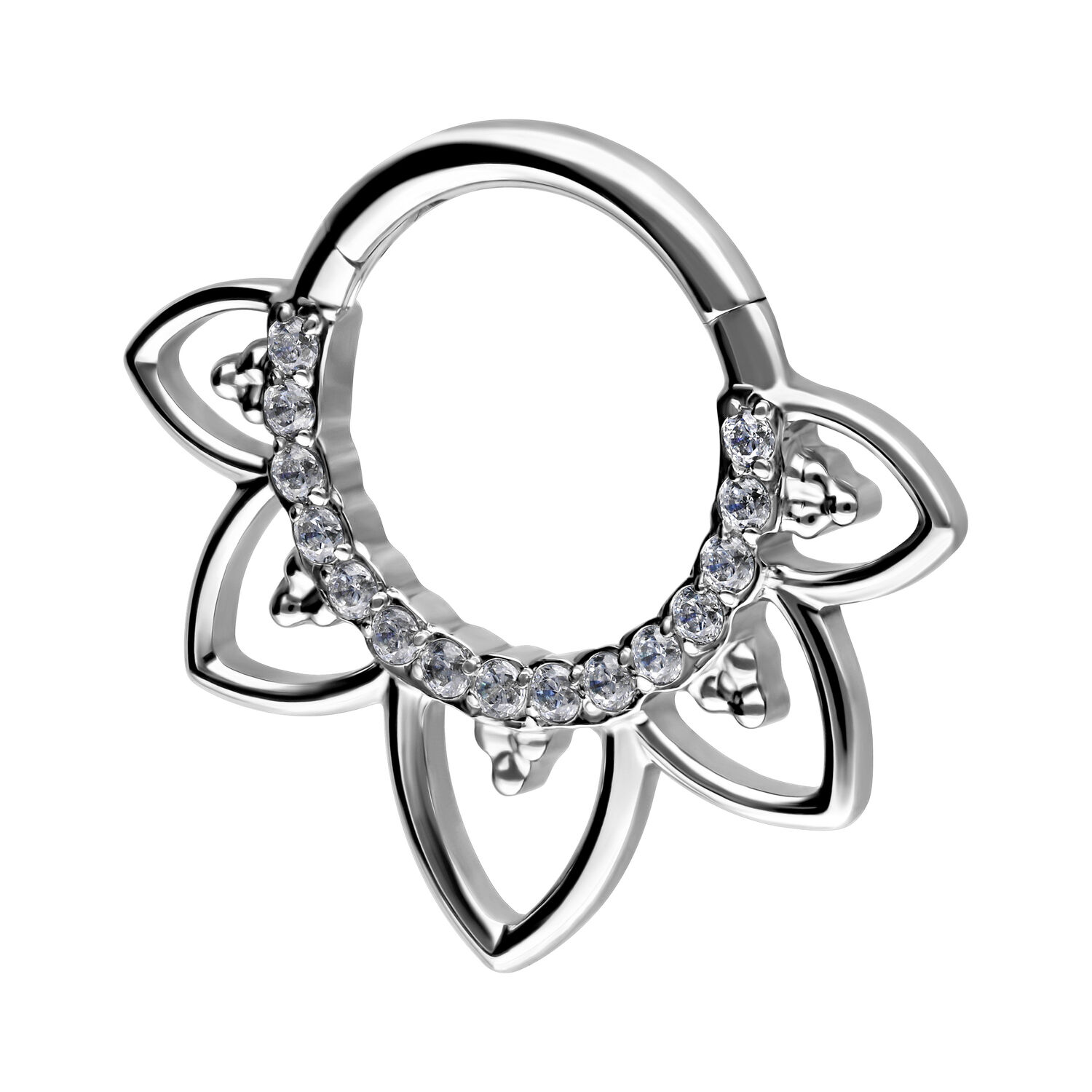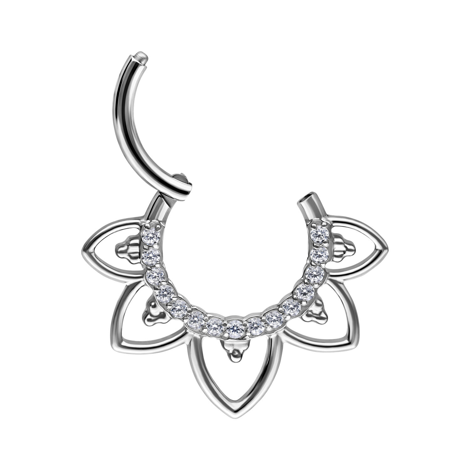 Our Oriental Crystal Septum Clicker is made of high-quality stainless steel and is ideal for your septum or Daith piercing. The piercing features a curved hinge bar that allows for easy handling when inserting the piercing – all without the need for assistance.