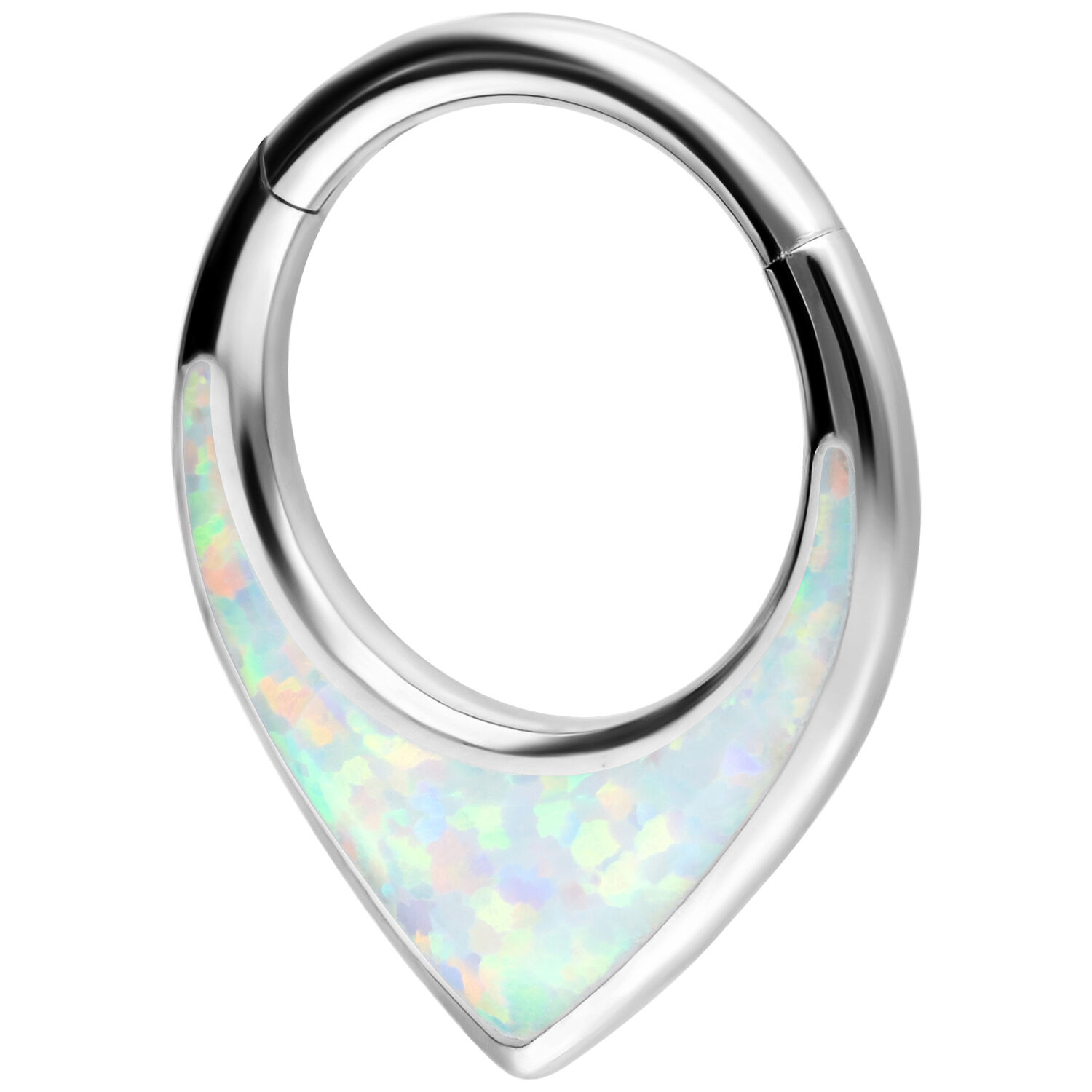 Our Chunky Opal Septum Clicker with hinge is easy to insert and can be worn not only as septum jewelry, but also in the ear or the lip frenulum (smiley). The piercing jewelry is made of high-quality silver-colored titanium and features a stunning synthetic opal stone. Opal stones are truly special—each piece is uniquely created and feels like a limited edition. Depending on the angle and lighting, our specially grown opals reflect vibrant or pastel flashes of color. Don’t miss out on this spectacle of color—get the full spectrum in the form of piercing jewelry!