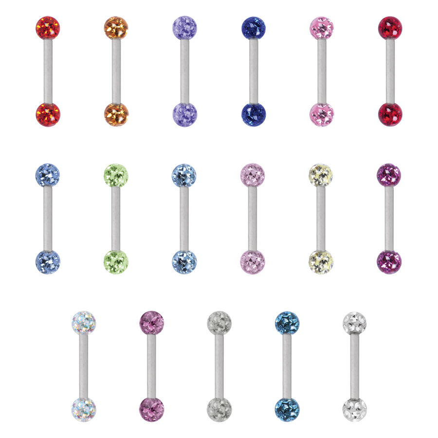 Die Titan Highline® Sealed Jewelled Barbells haben eine Stabstärke von 1.2 mm. Die Kugeln des Barbells sind mit edlen Kristallen besetzt und versiegelt. Der Stab ist externally threaded, die Kugeln lassen sich auf die Außengewinde unserer externally threaded Barbells schrauben.