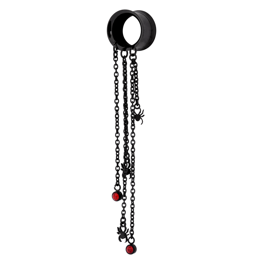 You love earrings, but to wear them through your tunnels they are too heavy or too annoying to take them out all the time? We may have a brandnew solution for you! With these double flared tunnels, we combined tunnels with beautiful dangling chains. It’s inner thread makes it easy to change your jewellery from time to time and to clean it everyday. The five dangling chains have the following lengths: 16 mm, 35 mm, 50 mm, 60 mm, 70 mm It has shiny filigran pendants like small spiders and beautiful dark zirconia crystals in the colour red. Tunnels are sold individually. It is a perfect everyday item but also a nice accessory for the next halloween party. Combine elegance with a cute gothic look!