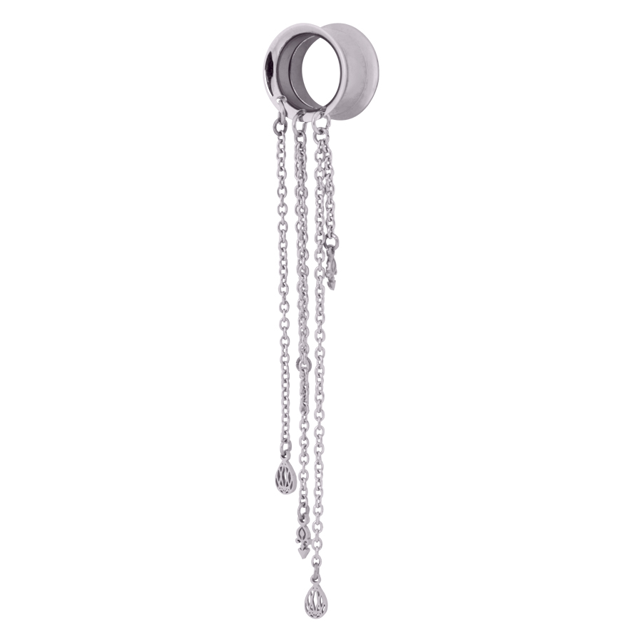 You love earrings, but to wear them through your tunnels they are too heavy or too annoying to take them out all the time? We may have a brandnew solution for you! With these double flared tunnels, we combined tunnels with beautiful dangling chains. It’s inner thread makes it easy to change your jewellery from time to time and to clean it everyday. The five dangling chains have the following lengths: 16 mm, 35 mm, 50 mm, 60 mm, 70 mm It has shiny filigran pendants like crystals in a teardrop shape and sweet lilys. Tunnels are sold individually. Keep your individual look mixed with coolness and elegance.