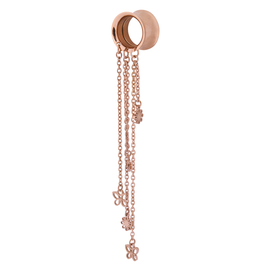 You love earrings, but to wear them through your tunnels they are too heavy or too annoying to take them out all the time? We may have a brandnew solution for you! With these double flared tunnels, we combined tunnels with beautiful dangling chains. It’s inner thread makes it easy to change your jewellery from time to time and to clean it everyday. The five dangling chains have the following lengths: 16 mm, 35 mm, 50 mm, 60 mm, 70 mm It has shiny filigran pendants like cute butterflies and small flower shapes. Tunnels are sold individually. It is a perfect everyday item but also a nice new rosegold accessory for your collection. Combine elegance with a cute bohemian look.